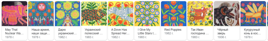 • Maria Prymachenko – was a Ukrainian folk art painter, who worked in the naïve art style. A self-taught artist, she worked in painting, embroidery and ceramics.